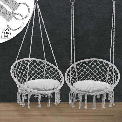 Le fauteuil suspendu se compose d’une structure en acier galvanisé robuste qui peut supporter jusqu’à 150kg de charge. Grâce aux 2 anneaux métalliques vous pouvez orienter la chaise comme souhaitée. Ces 2 anneaux permettent d’attacher les cordes de la chaise de façon groupée ou séparée.