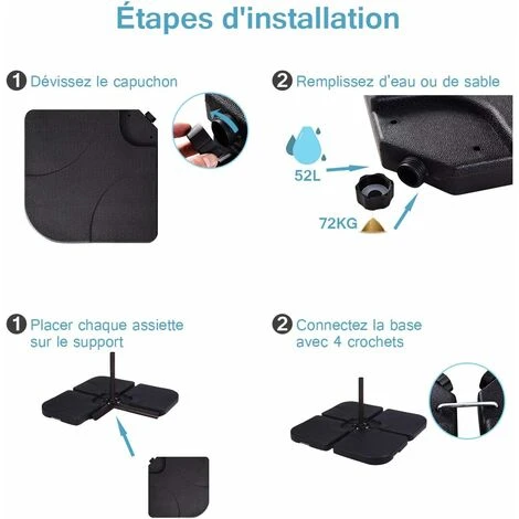 - ăFacile Ă assembler : 4 panneaux plats peuvent ĂȘtre simplement connectĂ©s avec des instructions dĂ©taillĂ©es. Il suffit d’ouvrir le capuchon et de verser suffisamment de sable ou d’eau, puis de placer chaque panneau sur le support transversal et de relier la base Ă l’aide des crochets robustes fournis.