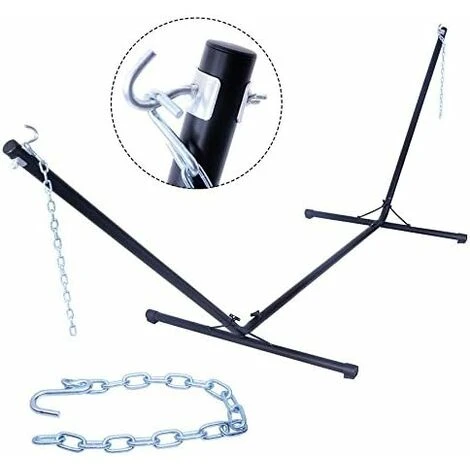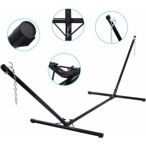 - Il est compatible avec de nombreux types de hamacs jusqu’à 320 cm. Fabriqué en acier robuste, le support est solide et résistant, stable et fiable pour une utilisation à long terme. 2 crochets d’attache ainsi que des chaînes vous permettent de régler facilement la hauteur du hamac en fonction de vos besoins. Le support est en outre mobile : vous pourrez l’emporter en camping et en voyage pour vous détendre. C’est le support de hamac idéal !