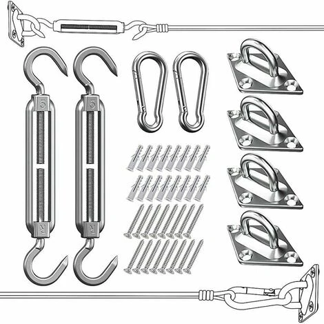 Tout le matriel dans un seul kit : 2 tendeurs, 4 illets en diamant, 2 mousquetons/crochets, 16 vis, 16 extenseurs en plastique. Avoir le bon matriel facilite l’installation. Le kit de matriel de voile d’ombrage facile utiliser s’adapte la plupart des types de voiles d’ombrage, ce qui facilite la configuration de votre lieu de loisirs prfr avec ce kit de montage d’ombrage pratique. Profitez de votre t frais. .