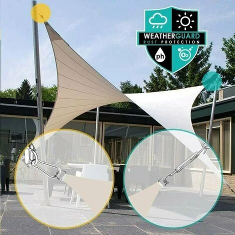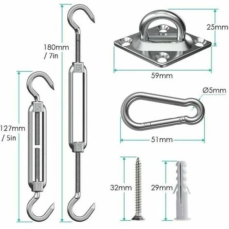 Tendeur rglable : le kit de quincaillerie pour voile d’ombrage comprend un tendeur rglable pour serrer la voile lors de l’installation. Longueur du tendeur : 12,7 cm, longueur d’extension : 17,8 cm pour rgler la tension ou la longueur des cordes, cbles, tirants et autres systmes de tension. Vous pouvez choisir la distance entre votre voile d’ombrage et le mur/poteau/point auquel il est attach.