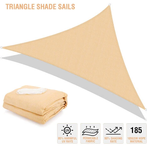 LE FORFAIT COMPREND – Contient un morceau de terrasse de protection solaire triangulaire de couleur sable de 5 x 5 x 5 m (anneau en D sur chaque bord en acier inoxydable 304), 4 cordes durables (2 m) et un manuel d’instructions.