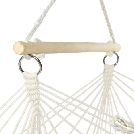 Appréciez le confort ultime de ce siège suspendu grâce à son assise moelleuse composée de 2 coussins beige de L.42 x l.42 CM ! Idéal pour lire un livre ou vous accorder un moment de repos bien mérité, ce siège suspendu saura combler vos attentes et vous faire sentir comme sur un nuage.Avec son design bohème macramé, ce siège s’adaptera aussi bien dans votre décoration intérieure qu’extérieure et apportera une touche de nouveauté et une ambiance détendue sur votre terrasse, balcon ou dans votre chambre ou votre salon !Constitué avec matériaux de haute qualité (structure en bois et assise tisée en polyester), ce siège suspendu macramé vous assure stabilité et robustesse, et peut supporter jusqu’à 150 kg.Pratique et peu encombrant, il est équipé d’un anneau en métal de 6 CM pour une fixation simplifiée. Il est également léger afin de vous permettre de le déplacer facilement.Vous pouvez ainsi l’installer en extérieur l’été, pour lire un bon livre tout en profitant d’un bain de soleil; et le rentrer à l’intérieur dès le début de la saison hivernale, pour vous y installer avec un bon plaid le temps de regarder le dernier épisode de votre série préférée ! Alors, laissez-vous tenter par ce siège suspendu et profitez ainsi de moments cocooning et relax tout au long de l’année ! Dimensions du hamac siège suspendu macramé- Dimensions hors tout : Longueur 90 CM x largeur 55 CM x Hauteur 100 CM- Longueur de la barre en bois : 90 CM- Diamètre de la barre en bois : 3 CM- Largeur de l’assise : 55 CM- Matière : Polyester et bois – Couleur : beige- 2 coussins inclus de 42 x 42 CM- Diamètre anneau de fixation en métal : 6 CMDécouvrez également toutes nos gammes de sièges suspendus sur notre boutique en ligne !