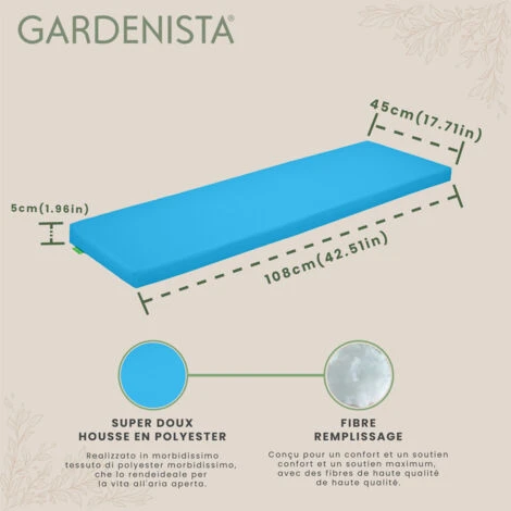 Le coussin de banc d’extérieur Gardenista a des dimensions de 108 cm de longueur, 45 cm de largeur et 5 cm d’épaisseur, offrant un coin salon spacieux et confortable pour une utilisation en extérieur et en intérieur.
