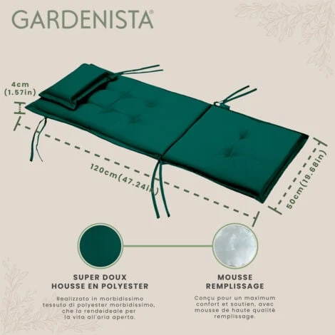 Le coussin de siège tufté pour chaise à dossier haut Gardenista mesure 120 cm de long, 50 cm de large et 4 cm d’épaisseur, ce qui en fait la taille idéale pour offrir une assise confortable à votre chaise à dossier haut.