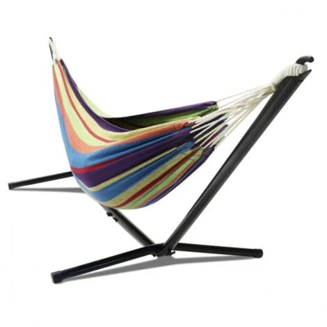 Laissez-vous séduire par le hamac avec support métallique et toile rayée multicolore !Véritable cocon dans lequel se bercer, accordez-vous des moments de lecture ou des bains de soleil en toute tranquillité et en toute sécurité dans votre jardin ou dans votre patio tout au long de l’été !Installez le hamac où bon vous semble; il ne nécessite pas de points d’accroche, il est léger et mobile !Ajustable, sa structure tubulaire en acier est recouverte d’une peinture époxy noire.Les pieds anti-dérapants et espacés de son support vous offrent une véritable stabilité et robustesse.Ses 22 cordes de suspension, ses crochets et anneaux permettent de suspendre sûrement la toile et une répartition du poids optimale.Sa toile est fabriquée à 40% de coton, 50% de polyester et à 10% de viscose avec une densité de 280 g/m². Elle offre un réel confort avec une surface de couchage de 200 cm (Longueur) x 150 cm (largeur).Facile à monter et à démonter. Possibilité de retirer la toile pour la nettoyer.Dimensions du hamac métal et toile rayée multicolore – Dimensions totales avec support : Longueur 268 CM x largeur 110 CM x Hauteur 115 CM- Dimensions de la toile : Longueur 200 x largeur 150 CM- Matière de la toile : 40% coton, 50% polyester et 10% viscose, densité de 280 gr/m²- Charge maximale supportée : 200 kg- Longueur de corde aux extrémités : 40 CM- Possibilité de retirer la toile pour la nettoyer- Facile à monter et à démonter