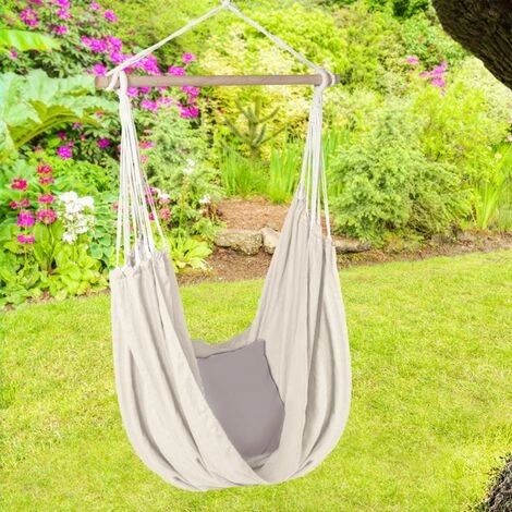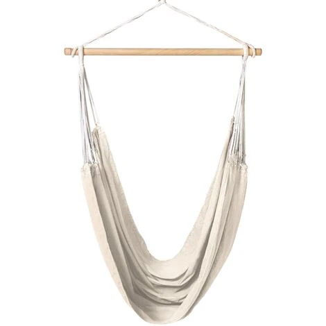 Descriptif du hamac siège suspendu avec toile écrueAccordez-vous un moment de détente dans ce hamac suspendu toile écrue tout en profitant de vos extérieurs. Véritable cocon dans lequel vous pourrez profiter d’un temps de lecture ou de repos, ce hamac siège suspendu vous procure tranquillité et sécurité. Pratique, le hamac siège suspendu est livré avec un mousqueton intégré pour une fixation simplifiée. Il vous est alors très facile d’accrocher le siège suspendu où bon vous semble ! Si vous souhaitez décrocher votre hamac pendant la saison hivernale et le ranger, un sac de transport est également intégré (100 x 14 x 9 cm). Fabriquée à 65% de coton et 35% de polyester, profitez d’une toile grand format 185 x 125 cm tout confort grâce à son grammage de 260 gr/m². Respirante, la toile ne vous tiendra pas chaud en cas de trop fortes chaleurs.Le hamac siège suspendu est également équipé d’une barre en bois de 4 cm de diamètre x 100 cm de longueur. Cette dernière permet de conserver un écartement idéal de la toile afin de profiter pleinement de votre assise suspendue. Dimensions du hamac siège suspendu avec toile écrueDimensions de la toile : Longueur 185 cm x largeur 125 cmNombre de cordes sur la toile : 12 de chaque côtéDimensions de la barre d’écartement en bois : L. 100 x Ø 4 cmNombre de cordes de chaque côté de la barre : 8Épaisseur des nœuds des cordes : 1,5 et 2,5 cmÉpaisseur des cordes : 0,5 cmCharge maximale supportée : 150 kgToile 260 gr/m² composée à 65% de coton et 35% de polyesterMousqueton en métal pour la suspension : 7 x 3,5 cmSac de transport inclusCoussin non vendu avec le hamacD’autres coloris sont disponibles sur ce modèle de hamac suspendu :- Hamac suspendu toile gris anthracite- Hamac suspendu toile rayée bleue et verteDécouvrez également tous nos hamacs avec support ou hamacs suspendus sur notre boutique en ligne !