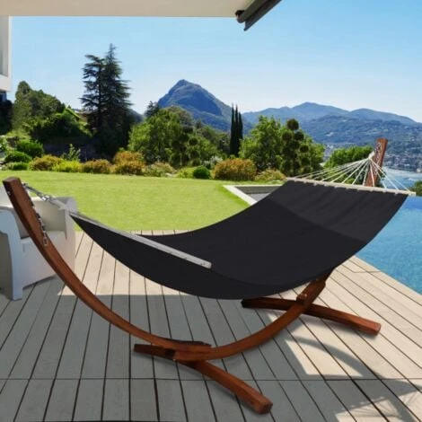 Accordez-vous des moments sous le signe de la détente grâce à ce hamac en bois. Posé sur votre terrasse, au bord de la piscine ou au milieu de votre jardin, profitez d’un doux moment de quiétude. Idéal dès le début des beaux jours, votre hamac à petit prix est la solution parfaite pour une sieste à l’extérieur, en solo ou à deux.La courbe parfaite de ce meuble d’extérieur et sa belle couleur boisée en font le compagnon idéal de votre mobilier de jardin. Facile à monter, sa structure en bois est l’assurance d’un hamac robuste et stable, permettant une charge maximale de 150 kilos.Le bois foncé est sublimé et contrasté par la toile en tissu noire, mélange de coton et de polyester. Cet alliage permet à la toile d’être résistante à l’usure, en plus d’être agréable au toucher. La couleur unie noire de la toile du hamac s’accorde à tous les extérieurs sans jurer avec votre mobilier de jardin. Offrez-vous un meuble d’extérieur à petit prix grâce à ce hamac fiable et esthétique.Après une baignade dans la piscine familiale ou pour une sieste digestive, accordez-vous le luxe d’un repos bien mérité dans un hamac de qualité.Dimensions du hamac en bois XL avec support bois toile noire- Dimensions totales : Longueur 310 CM x largeur 120 CM x Hauteur 120 CM- Surface de couchage : Longueur 200 x largeur 110 CM- Epaisseur du support bois : 8 x 5 CM- Composition de la toile : 55 % coton, 45 % polyester 320 gr/m²- Dimensions de la toile : L. 200 x l. 110 CM- Charge maximale supportée : 150 kg- Poids : 24 kgRetrouvez nos autres coloris disponibles sur ce modèle : – Hamac XL avec support bois et toile écrue- Hamac XL avec support bois et toile gris anthracite- Hamac XL avec support bois et toile rayée noire, blanche et chocolatDécouvrez également toute notre gamme de hamacs pour profiter de votre été !