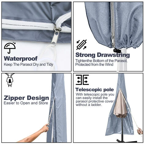 – Avec tige et fermeture éclair, pour une mise en place plus facile sur le parapluie debout