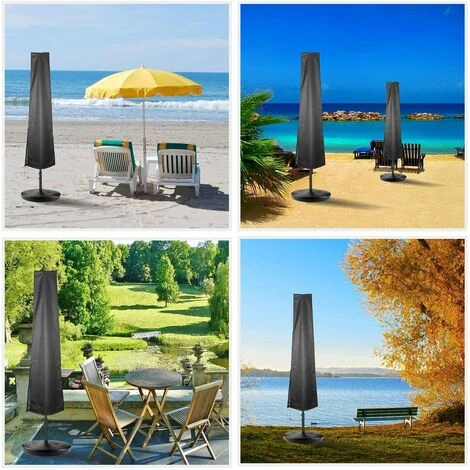 La housse de parasol a un cordon de serrage réglable et une fermeture éclair. Ces sangles rendent la couverture du parasol plus serrée. La housse de protection du pare-soleil n’est pas emportée par le vent.