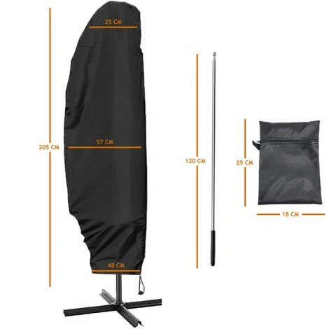 Cette housse de protection pour parasol déporté est de coloris noir et mesure 205 cm de hauteur, 48 cm de largeur sur le haut, et 57 cm de largeur sur le centre et 25 cm de largeur sur le bas de la housse. Cette housse est pour un parasol déporté.