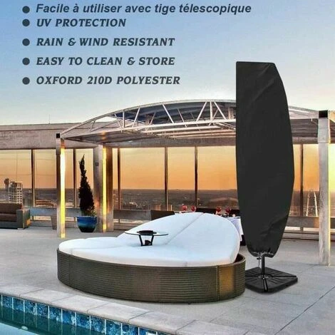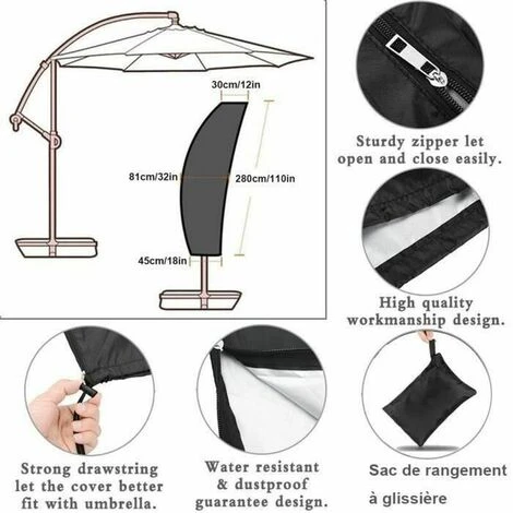 Polyester Oxford 210D. rotection idéale, p.ex contre les rayons UV, les intempéries, le pollen, les excréments d’animaux. Le forfait comprend: 1x Housse de Parasol 280CM, 1x Sac de rangement, 1x tigetige télescopique. Taille: 280 * 45 * 81 * 30cm