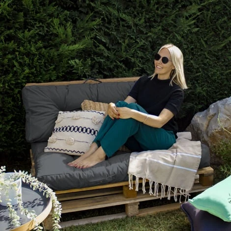 Fabriqué à la main en tissu oxford en 100% polyester et garni d’une belle épaisseur de flocons de mousse de 20 cm tant sur le dossier que sur l’assise ce kit de coussins capitonnés pour palette est ultra confortable.