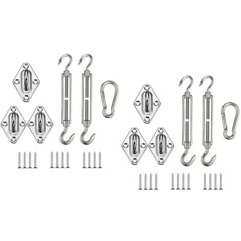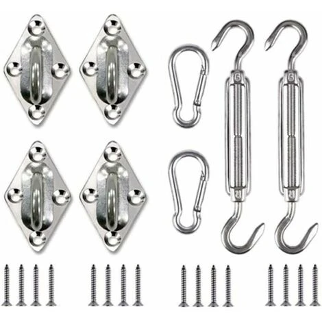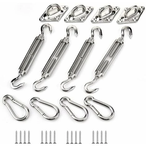 Ensemble de fixation de store utile : ensemble de fixation en acier inoxydable pour votre auvent. Liaison entre support, mur et voile d’ombrage. Convient pour terrasse et jardin. Détails : – Matériau : acier inoxydable. – Poids : 380g – Pour un maintien sûr et une tension optimale. – Diamètre de chaque pièce : 5 mm chacune. – Support mural : forme de diamant, épaisseur de la plaque : 2 mm, épaisseur du corps : 5 mm, trou : environ 5 mm. – Mousqueton : Longueur : 5 cm. – Vis de tension : gamme 130-180 mm. L’ensemble comprend 4 supports muraux, 4 mousquetons, 4 tendeurs et 16 vis