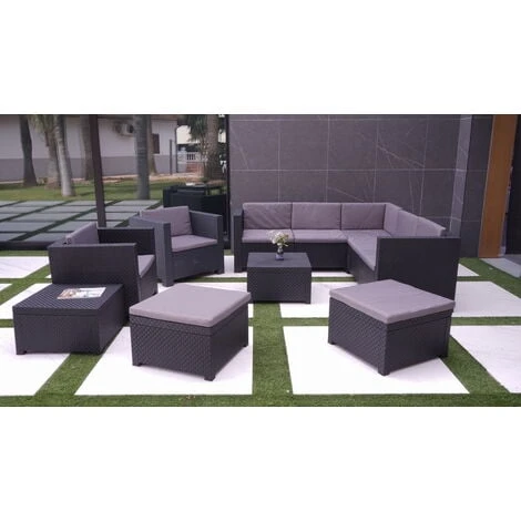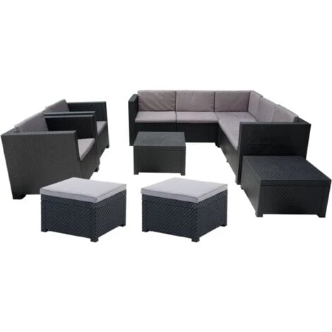 Salon de Jardin 9 places en résine tressée recyclée. Composé d’2 fauteuils, un canapé d’angle, 2 poufs et 2 tables basses