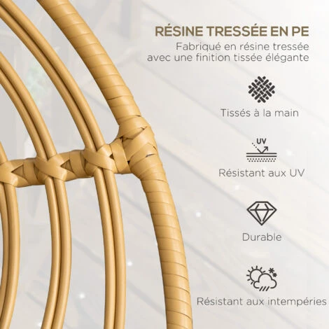 – Matériaux principaux : acier, résine tressée PE aspect rotin, mousse de rembourrage et tissu de polyester