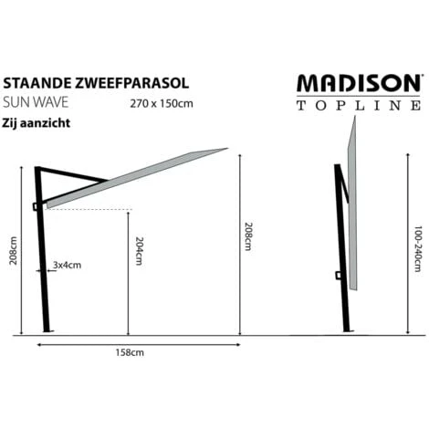 Veuillez noter que ce parasol a besoin d’un pied de parasol d’un minimum de 30 kg ou d’un support de balcon Madison (non inclus). Le parasol Sun Wave est mieux protégé avec une housse de parasol Madison vendue séparément dans notre assortiment.