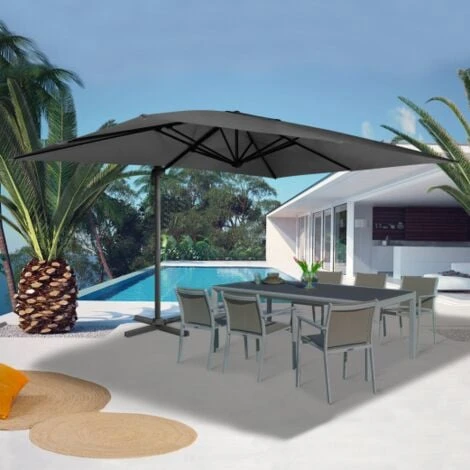 Le parasol est l’accessoire indispensable pour protéger votre espace extérieur et profiter de votre terrasse en toute tranquillité cet été. Grâce au parasol rectangulaire CALVI, vous pouvez partager d’agréables repas bien abrité, accompagné de vos amis et de votre famille.Conçu avec une toile gris en polyester de 230 gr/m², le parasol filtre les rayons du soleil afin de vous protéger efficacement. Avec ses dimensions de 3×4 M, vous disposez d’une grande surface ombragée de 12 M². Vous pouvez ainsi accueillir de nombreux convives cet été tout en bénéficiant d’une occultation maximale. Pensé pour votre sécurité, le parasol est fabriqué avec des matériaux de qualité résistants. Son mât en aluminium ainsi que son armature et ses pieds en acier (en forme de croix) vous assurent stabilité et robustesse. Une telle conception garantit une durée de vie importante à votre parasol. Avec ses fonctions inclinable et rabattable, le parasol est aussi rotatif jusqu’à 360°. Vous pouvez ainsi diriger votre parasol selon l’orientation du soleil et vous protéger des rayons à tous moments. Conseil ID Market : Afin de stabiliser un maximum votre parasol, ajoutez des dalles prévues à cet effet autour des pieds (dalles non fournies).Dimensions du parasol déporté rectangulaire gris rotatif 360°- Dimensions totales hors tout : Longueur 400 x largeur 300 x Hauteur 270 CM- Dimensions des pieds : 50 x 50 CM- Mât aluminium : 2,2 MM d’épaisseur- Bras articulé acier : 0,9 MM d’épaisseur- Baleines : 0,8 MM d’épaisseur- 6 inclinaisons possibles- Toile polyester grammage 230 gr/m² – Vendu sans lestageDécouvrez tous nos parasols CALVI disponibles en différents coloris :- Parasol déporté CALVI 3×4 M écru- Parasol déporté CALVI 3×4 M taupeDécouvrez également toute notre gamme de parasols sur notre boutique en ligne ! – HORS CORSE -article non livrable en Corse