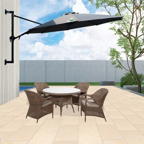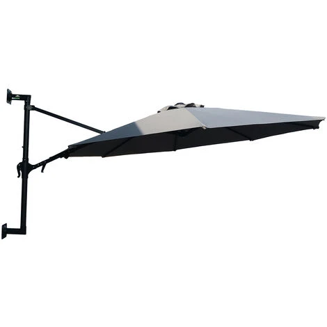 - Les boulons pour fixer le support du parasol au mur : non inclus. Des trous standard sont prévus pour fixer le bras au mur. Selon le type de mur (pierre, bois, …), vous devrez prévoir 2 boulons M8 ou M10 appropriés d’une longueur de 60 mm.