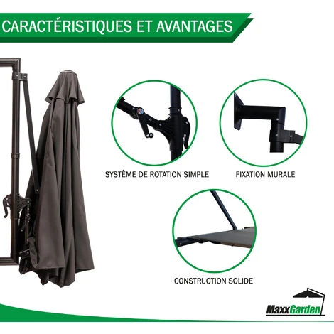 - Nous vous recommandons la housse de protection MaxxGarden compatible qui est également vendue par Mano Mano (recherchez le code EAN 5404022208904). La fermeture éclair ne peut pas être complètement fermée, mais grâce aux cordes de tension, vous pouvez toujours couvrir le parasol pour l’hiver.