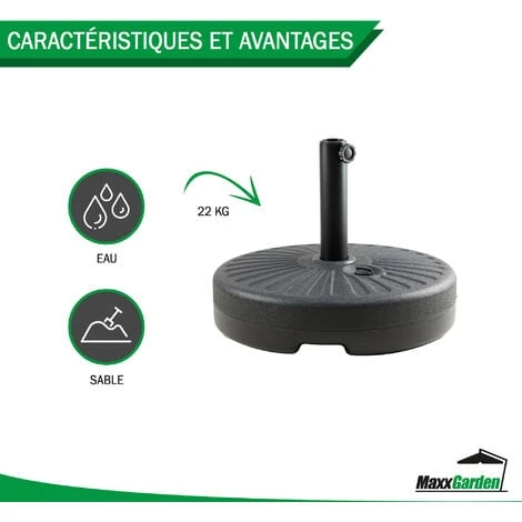 - Étendue de la livraison : 1 x Base de parasol MaxxGarden avec design – plastique – remplissable jusqu’à 22Kg