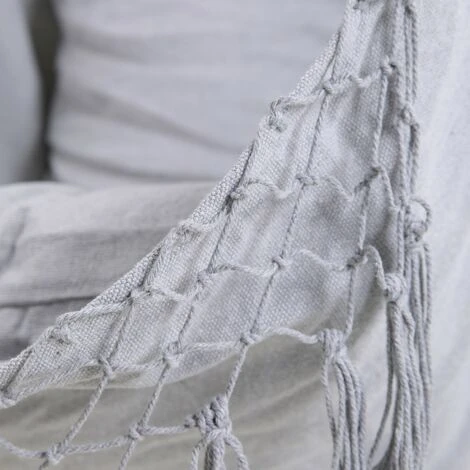 – CARACTÉRISTIQUES : Dimensions du siège : 140 x 100 cm – Coussins : 50 x 50 cm – Hauteur de la base du siège au nœud de fixation supérieur : 140 cm – Dimensions de la barre en bois : Diamètre 0,3 x L 90 cm – Matériau du siège : Polycoton 300 gr/m² – Coussins amovibles. Non amovible – Matériau du rembourrage du coussin : Polyester – Matériau de la barre horizontale : Bois – Charge maximale : 100 kg – Kit de fixation au plafond en acier non inclus – Poids net : 2,6 kg – Poids brut : 3,6 kg – Couleur : Gris – Code RE6697
