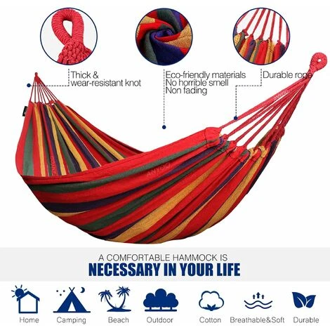 - DURABLE AVEC UNE GRANDE CAPACITÉ: Imperméable résistant à la moisissure, le coton tissu lavable en machine de la durabilité est le point culminant de cet hamac brésilien. Il est assez fort pour supporter jusqu’ à 200 Kg.