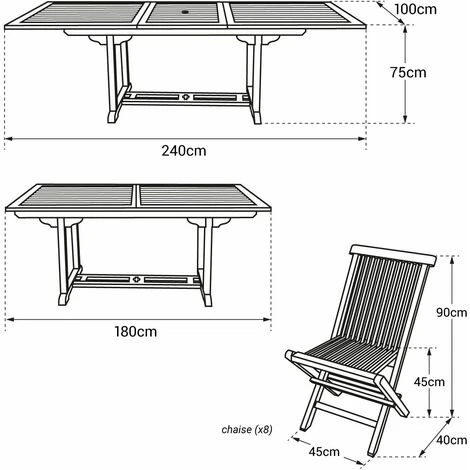 – Table : L 180 Ă 240 Ă l 100 Ă H 75cm