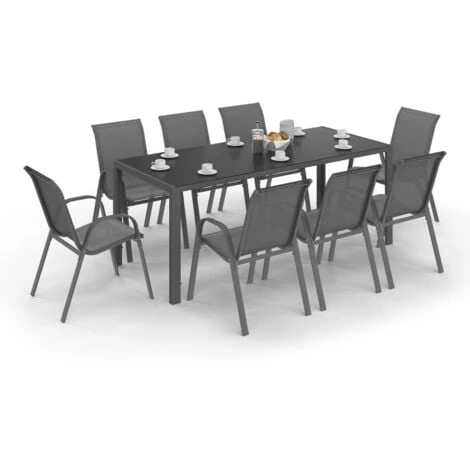 Salon De Jardin MADRID Table 190 CM Et 8 Chaises Empilables Gris Anthracite