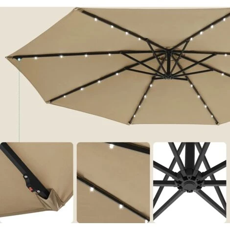 Ce que vous obtenez : Un parasol déporté avec LED, une manivelle pour ouvrir et refermer facilement la toile ainsi qu’une base en croix. Ajoutez des poids de 70-90 kg (non inclus) ou plus au-dessus de la base pour plus de sa stabilité
