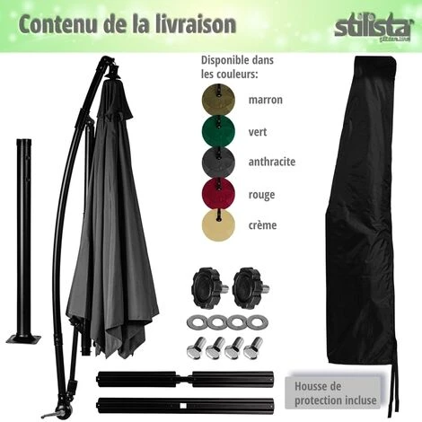 Le beau et pratique parasol STILISTA de 350 cm est doté d’une toile en polyester de 180 g/m². Notre parasol ombrageant est doté d’une structure stable en acier revêtu par poudre. En outre, le parasol de jardin possède 24 LED pour une lumière agréable le soir, l’éclairage est alimenté par un panneau solaire intégré. Le parasol présente de nombreux points forts, comme une manivelle pratique pour l’ouverture et la fermeture et un pied en croix pour une bonne stabilité. Nous proposons notre parasol de terrasse en cinq couleurs : crème, marron, vert, rouge et anthracite. Contenu de la livraison: 1x Parapluie 1x matériel de montage 1x housse de protection pour parasol 1x notice de montage