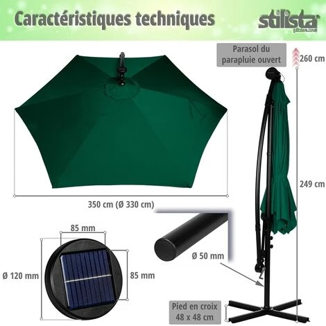 Taille du parapluie: 350 cm, Diamètre du parapluie: 330 cm, Hauteur du parapluie fermé: 249 cm, Hauteur du parapluie ouvert: 260 cm, Diamètre des tiges: 50 mm, Nombre de LED: 24 avec interrupteur marche/arrêt intégré, Durée d’éclairage env. 8 heures