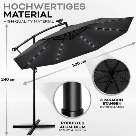Ce parasol suspendu est doté d’un éclairage LED composé de 32 lampes à LED pouvant être allumées et éteintes à l’aide d’un interrupteur.